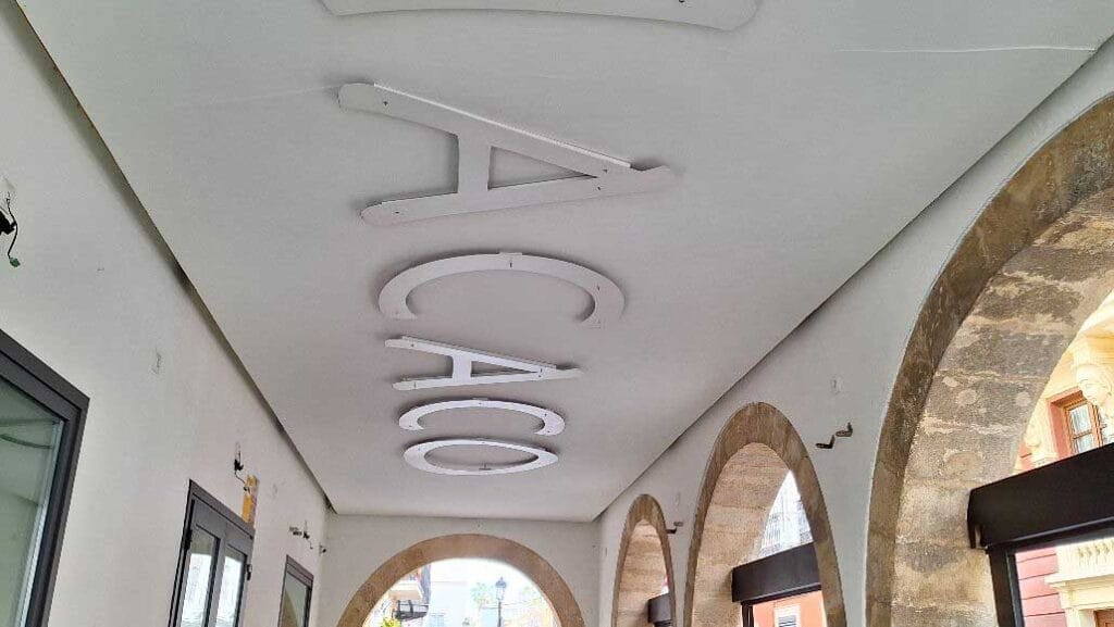 Pues bien, en dichos portales el pub anteriormente citado ha privatizado ilegítimamente el espacio público. Para ello: ha cerrado los huecos de las tres arcadas con estructuras metálicas fijas que soportan bancos interiores (FOT. 3); ha instalado numerosos elementos tales como grandes maceteros en los accesos para estrechar el paso, etc. (FOT. 4); ha ocultado la techumbre original, sin ningún respeto al patrimonio, con un techo de escayola para situar el nombre del local (FOT. 5); y para colmo alerta a los viandantes con dos carteles en los que avisa: “¡ATENCIÓN! Está usted cruzando por una propiedad privada”. (FOT. 6)