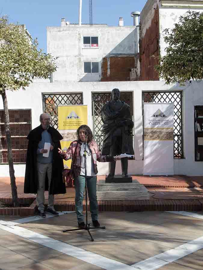 La presentación fue iniciada por Fátima Graván, miembro de la Junta Directiva de Betilo, que recordó que el monumento fue inaugurado en el año 1951 y que se mantuvo hasta el año 1994 en que se desmontó para la construcción del aparcamiento subterráneo y se volvió a montar después de la conclusión de las obras. Pero el busto sobre pedestal original fue sustituido por una escultura de cuerpo entero que transformó la esencia de la escultura. A partir de entonces, el paso del tiempo y el vandalismo han deteriorado de forma considerable el estado del monumento, lo que evidencia la necesidad de su restauración, más si cabe estando situado justo a las puertas del Ayuntamiento y formando parte de la imagen que la ciudad transmite a todos los que por allí transitan (FOT. 2).