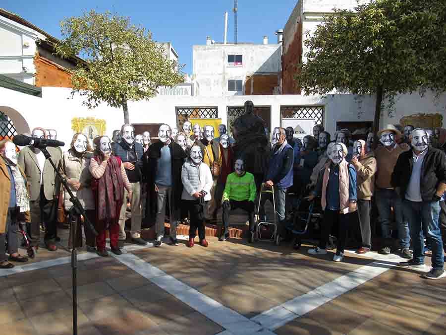 La celebración del 146 aniversario de su nacimiento fue la fecha elegida para el acto reivindicativo, y a la convocatoria de Betilo asistió más de un centenar de personas Para personalizar la presencia imaginaria del dramaturgo y reforzar su demanda ante las autoridades municipales, los asistentes cubrieron sus rostros con caretas que portaban la cara de Pedro Muñoz Seca (FOT. 1).