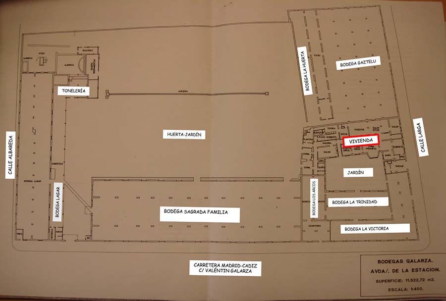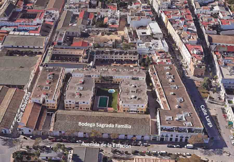 La bodega Sagrada Familia data de 1829 y es la de mayor valor arquitectónico de un conjunto ubicado entre la calle Larga y la Avenida de la Estación (FOTO 3). Aunque no se conoce quien la edificó, ya consta en la relación de propiedades de Joaquín de la Vega que aparecen en su partición de bienes redactada en 1841 (Archivo Histórico Provincial, Protocolos Notariales, Legajo 0490 Cádiz). En el plano geométrico de Miguel Palacios Guillén del año 1865 está asignada a Manuel Gaztelu Iriarte y en tiempos recientes perteneció a bodegas González Byass y posteriormente a Fernando A. de Terry.