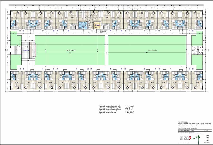 Para ello, se deberá crear una estructura metálica independiente, sin tocar los muros ni los pilares y sobre la solera existente se ejecutará un forjado suspendido para paso de instalaciones que evitará efectuar perforaciones (FOT. 7). Los apartamentos estarán dispuestos en las naves laterales, dejando el espacio central diáfano. Se añadirán dos lucernarios longitudinales en la nave central para aportar iluminación y resaltar los artesonados. La cubierta conservará la estructura de madera original de cerchas y correas, se retejará con teja cerámica curva sobre aislamiento y ripia existente.