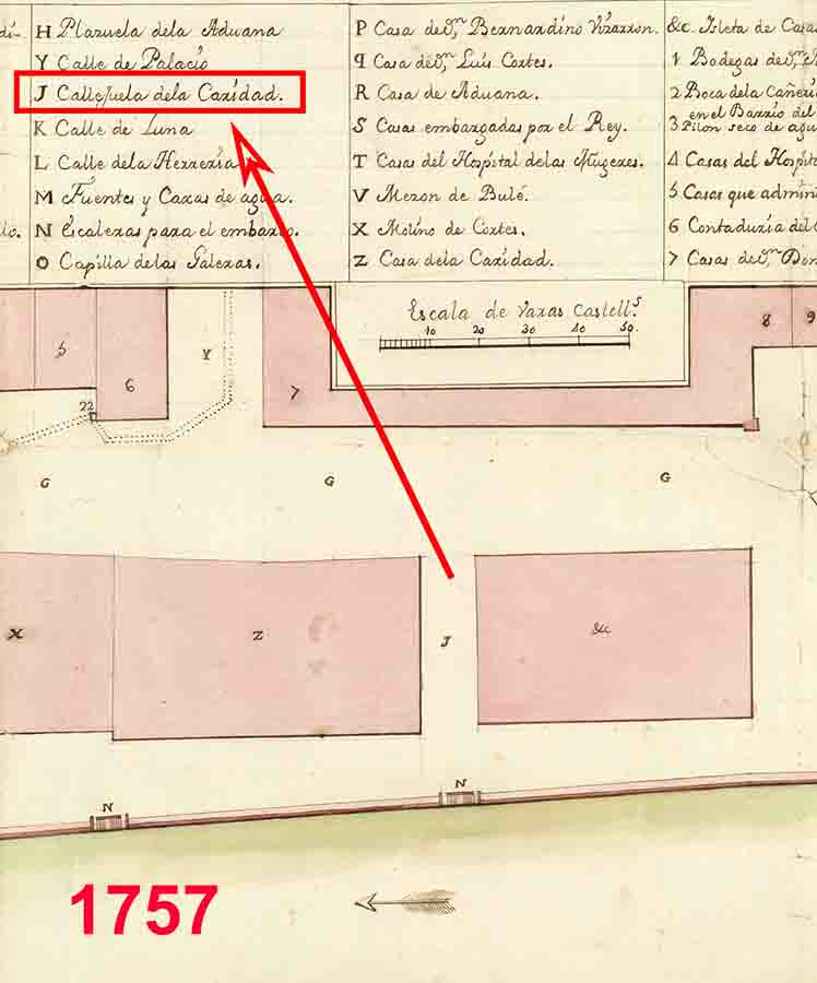 No es este el único nombre que ha tenido esta calle que allá por el siglo XVIII era conocida popularmente como 𝗰𝗮𝗹𝗹𝗲𝗷𝘂𝗲𝗹𝗮 𝗱𝗲 𝗟𝗮 𝗖𝗮𝗿𝗶𝗱𝗮𝗱, al encontrarse frontera al hospital homónimo. Así consta un plano de 1757 (FOT. 2).