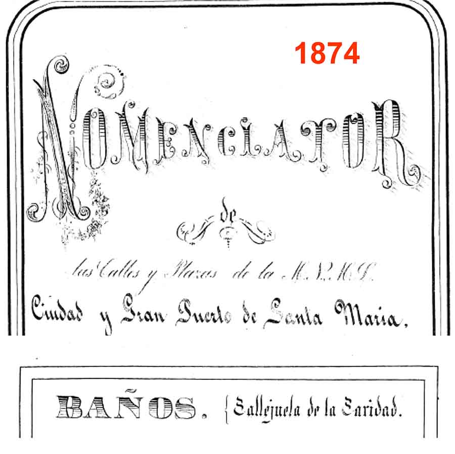 En la siguiente centuria, en concreto en 1840 pasó a denominarse 𝗰𝗮𝗹𝗹𝗲𝗷𝘂𝗲𝗹𝗮 𝗱𝗲 𝗹𝗼𝘀 𝗕𝗮ñ𝗼𝘀, en referencia a los baños flotantes que se establecieron frente a ella en la margen derecha del río de los que nos da noticia el historiador E. Pérez Fernández en su libro El vergel del Conde y el Parque Calderón… 2000 (FOT. 3).