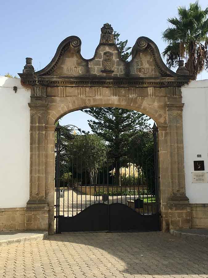 El acceso al conjunto se realiza por la calle San Francisco a través de una gran puerta con un característico remate y aire neobarroco, retranqueada desde la acera de la calle, y delimitada por columnas y con una cornisa y frontón calado o entrecortado, todos de piedra, realizándose el cerramiento a través de rejas de hierro. En el frontón, que está rematado por unos racimos de uvas, puede verse el escudo de la familia Caballero y una inscripción que pone “AÑO 1830”. Este espacio de entrada tiene también un zócalo y dos óculos cuadrifolios de piedra a cada lado de la portada (FOT. 2).