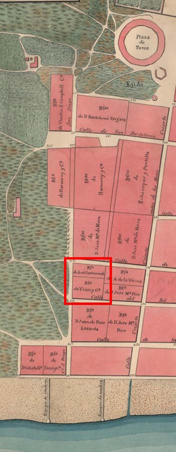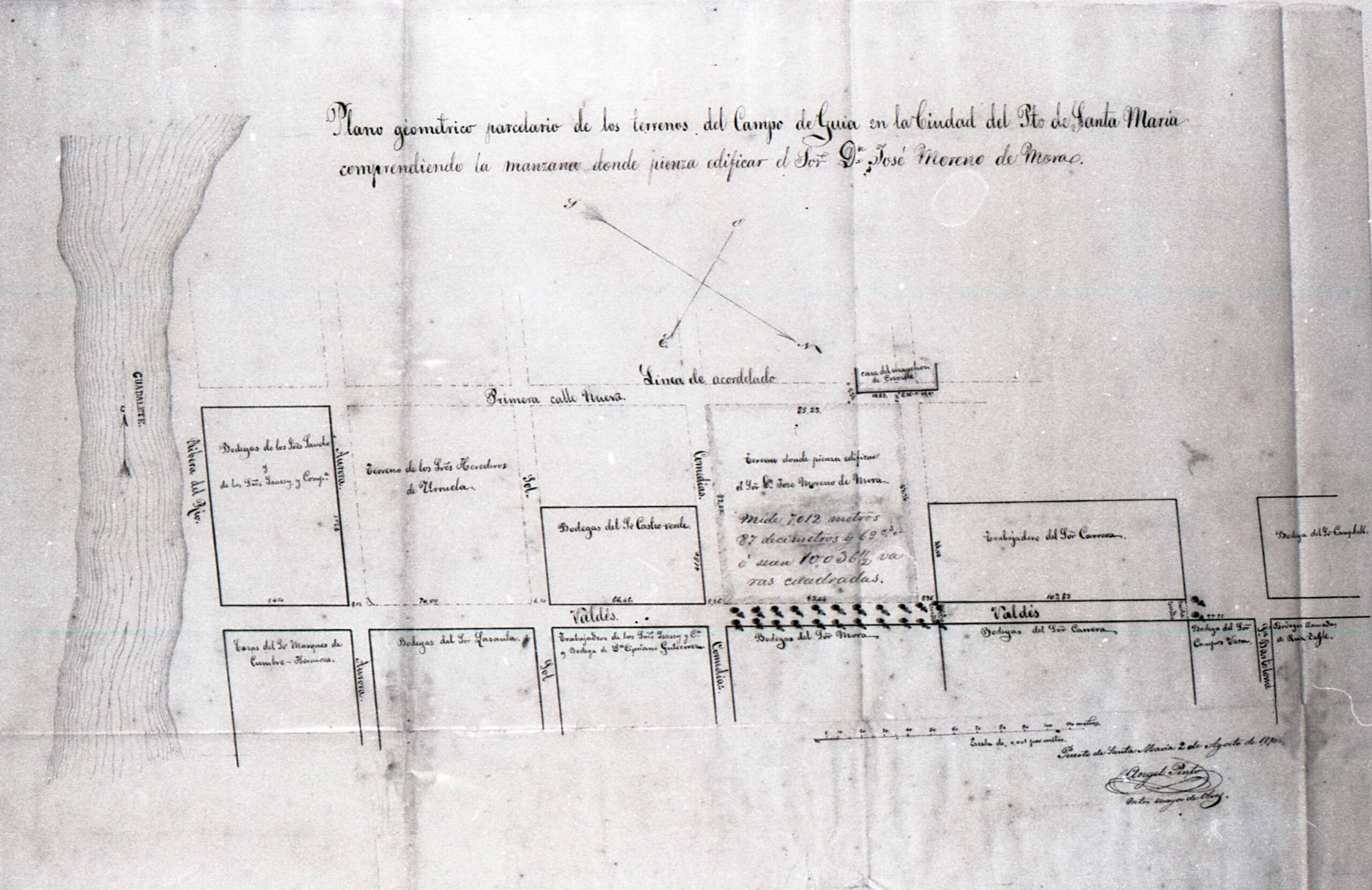 Este terreno había sido objeto de un conflicto sobre su propiedad dirimido ante la Diputación Provincial de Cádiz entre José Castroverde Marín y José Campos Vaca (AHMPSM, Sección Policía Urbana, Año 1870, Exp. 39). El primero alegaba que había adquirido los terrenos al Estado en el año 1861y el segundo que lo había heredado de su madre María Dolores Vaca Tardío y ésta de su marido Francisco Ortega que la había adquirido en pública subasta a un mayorazgo de los Sres. Coghen en el año 1832. Aunque el expediente no está completo, parece evidente que la Corporación Provincial dictaminó a favor del Sr. Castroverde.