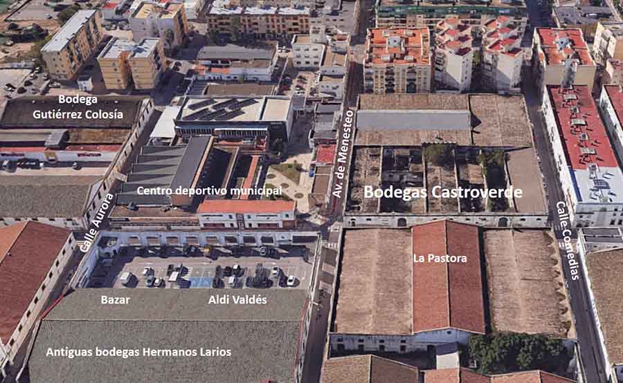 La manzana comprendida entre las calles Valdés, Comedias, Avenida de Menesteo y Pedro Pérez Fernández constituye una sola finca, aunque está constituida por dos edificaciones diferenciadas: la antigua bodega de José Castroverde con fachada principal y entrada por la calle Valdés (FOT. 1) y una ampliación en la zona trasera con entrada por la Avenida Menesteo (FOT. 2), edificada con posterioridad utilizando una estética similar.