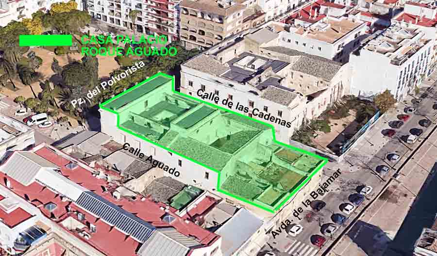 En el número 11 de la plaza del Polvorista, delimitando junto con la casa de “Las Cadenas” el frente sureste de dicha plaza, se levanta la conocida popularmente como casa de Roque Aguado (FOT. 1). Ocupa la manzana comprendida entre la plaza del Polvorista, a la que mira su fachada principal, calles de las Cadenas, Aguado, y Bajamar (FOT. 2).