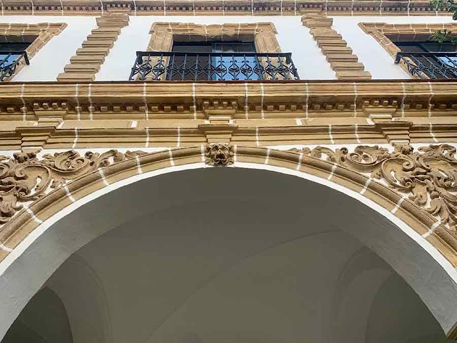 En su origen tuvo dos plantas (FOT. 3), la inferior con cuatro galerías abiertas al patio por arcos de medio punto apeados sobre columnas toscanas y la superior con balcones adintelados flanqueados por pilastras almohadilladas.