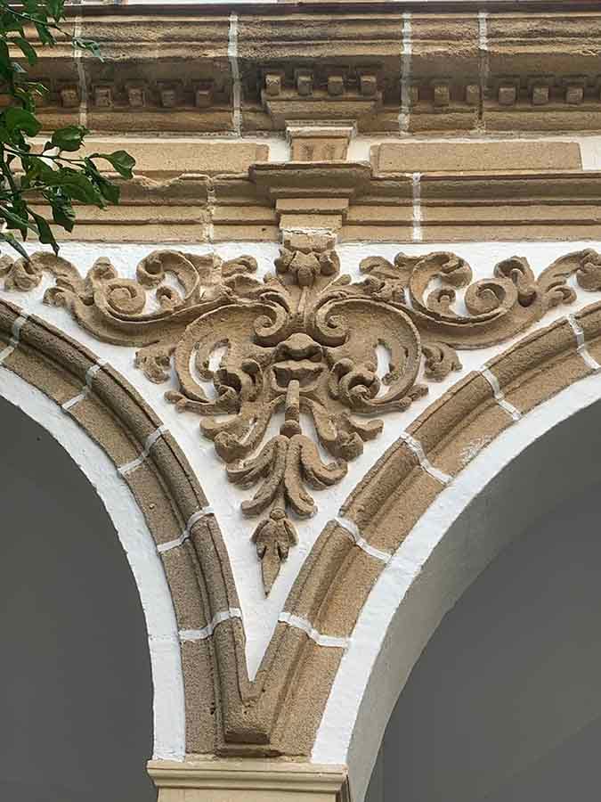 La arquería del claustro bajo se encuentra decorada con cabezas a modo de grotescas máscaras que ocupan las claves de todos los arcos (FOT. 4), excepto los centrales de cada crujía, donde se sitúan los escudos de distintas Órdenes mendicantes (dominicos (este), franciscanos (sur), benedictinos o cartujos (oeste) y mínimos (norte). Por su parte las enjutas están decoradas con roleos vegetales que recuerdan cabezas de monstruos (FOT. 5).