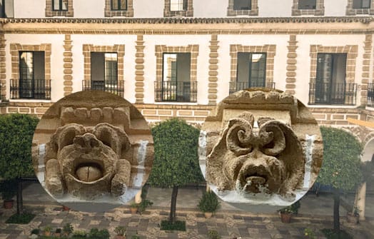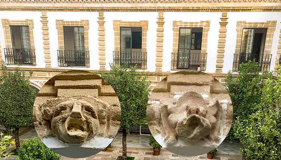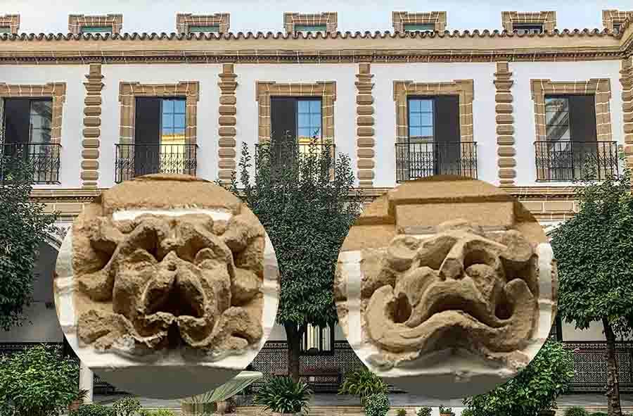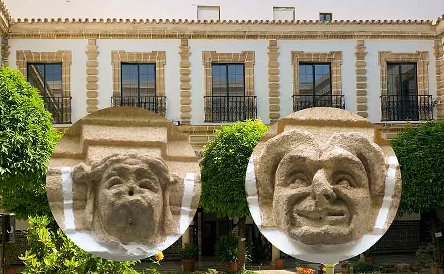 Todas las máscaras, representaciones simbólicas mas o menos explicitas de vicios o pecados, han sido analizadas por el Dr. Aguayo Cobo (Rev. de Hist. de El Puerto, 39, 2007) quien considera que su emplazamiento en el patio claustral no es aleatorio y responden a un programa iconográfico preciso.