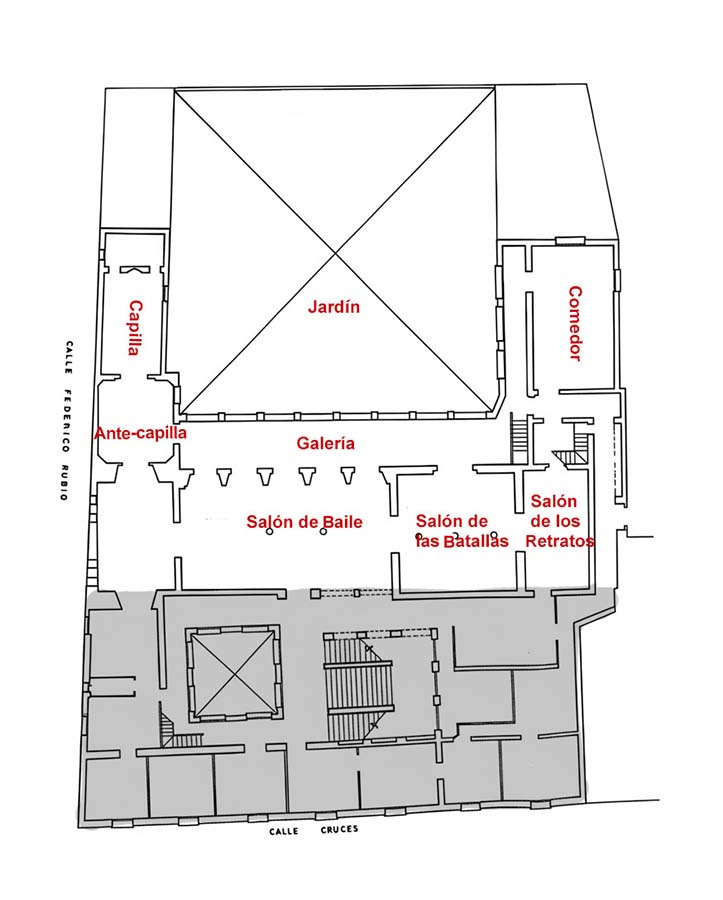 El edificio, de cuya suntuosa decoración interior se hacen eco todos aquellos que transitaron por sus salones (FOT. 1), presenta una organización interna en dos sectores diferenciados: uno frontal que incluye las estancias de la fachada principal y el patio (FOT. 2 gris) y otro posterior formado por los grandes salones, capilla, galerías y dependencias que rodeaban el extenso jardín trasero (FOT. 2 blanco).