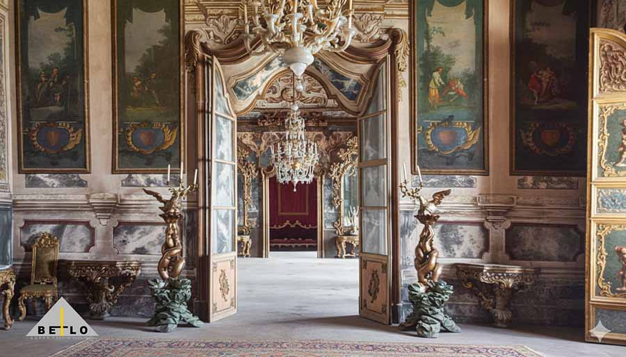 Una puerta del frente daba paso al salón del Trono (en referencia al salón de Baile), en el que se advertía una gran profusión de pinturas y adornos (FOT. 8). Techo cóncavo dejaba ver una pintura al fresco, figurando la balaustrada de una galería […]. Dos antiquísimas arañas de cristal opaco pendían de este techo. A la izquierda lucían cinco lienzos de colosal tamaño con preciosas molduras, que nos dijeron ser de Jordan (Lucas Giordano) y el Greco […]. Cinco huecos daban paso por la derecha a una galería; los tableros de las puertas contienen altos relieves bronceados, representando grupos mitológicos…. (FOT. 9)
