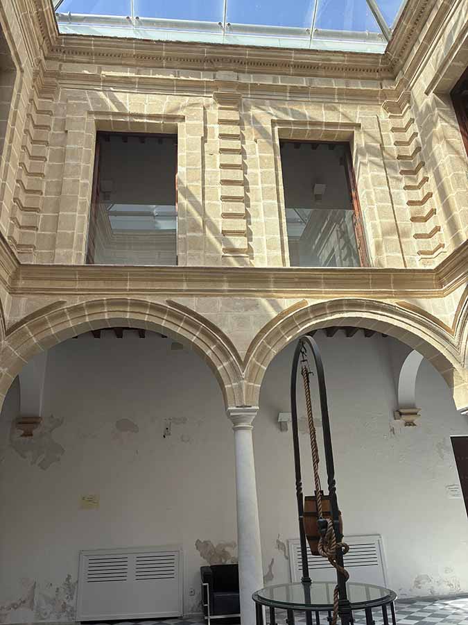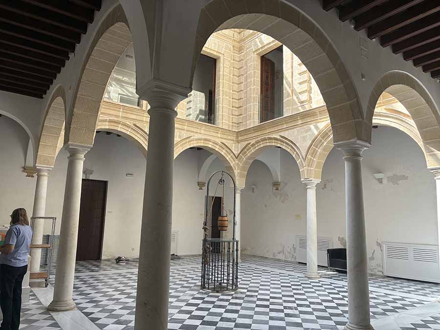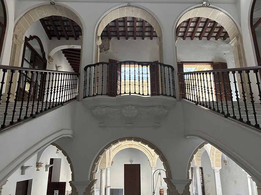 Tras cruzar la puerta principal, en calle Cruces, un zaguán sirve de acceso desde la calle a un patio de columnas, de planta cuadrada (FOT. 3). Tiene dos cuerpos superpuestos separados entre sí por una cornisa que se apoya en cada frente en dos arcos de medio punto, soportados por columnas toscanas de mármol blanco (FOT. 4). En el mismo se abre una escalera monumental, de tipo imperial, cubierta con una cúpula sobre pechinas, por la que se accede a la planta noble (FOT. 5). A decir de los especialistas este patio es muy pequeño en comparación con la grandiosa escalera de doble tramo, lo que demuestra la diferencia de épocas de construcción de uno y otro.