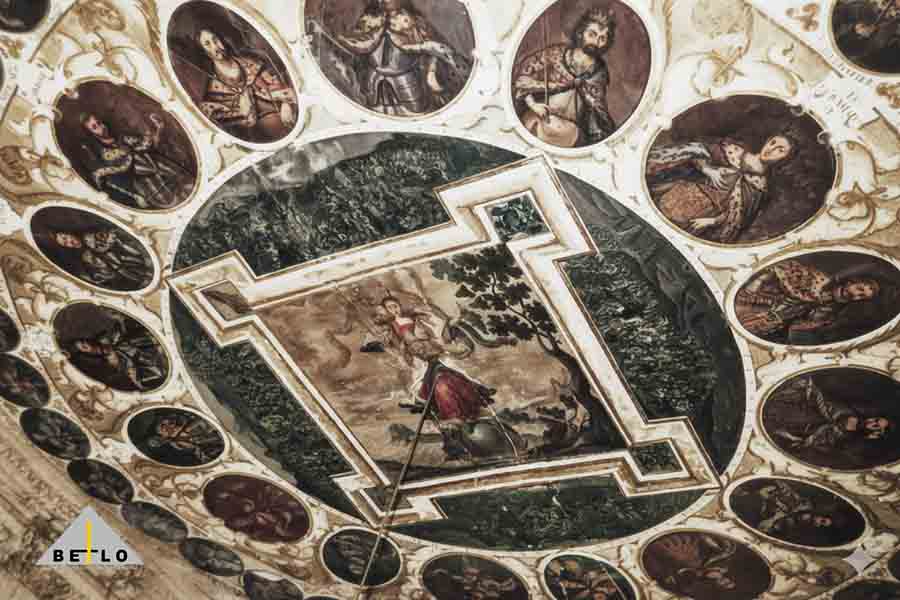 “…el salón de los Reyes llamado así por las pinturas que lo adornan […] (FOT. 7). El techo está pintado al óleo y dorado, y en su centro se ve un bellísimo recuadro de alto relieve con una alegoría de España, representada por una figura de pie sobre el mundo […]. En dos grandes óvalos formados por medallones se ve los bustos bien delineados de todos los reyes de Asturias, Castilla y León, desde Pelayo hasta el último monarca de la Edad Media…”.