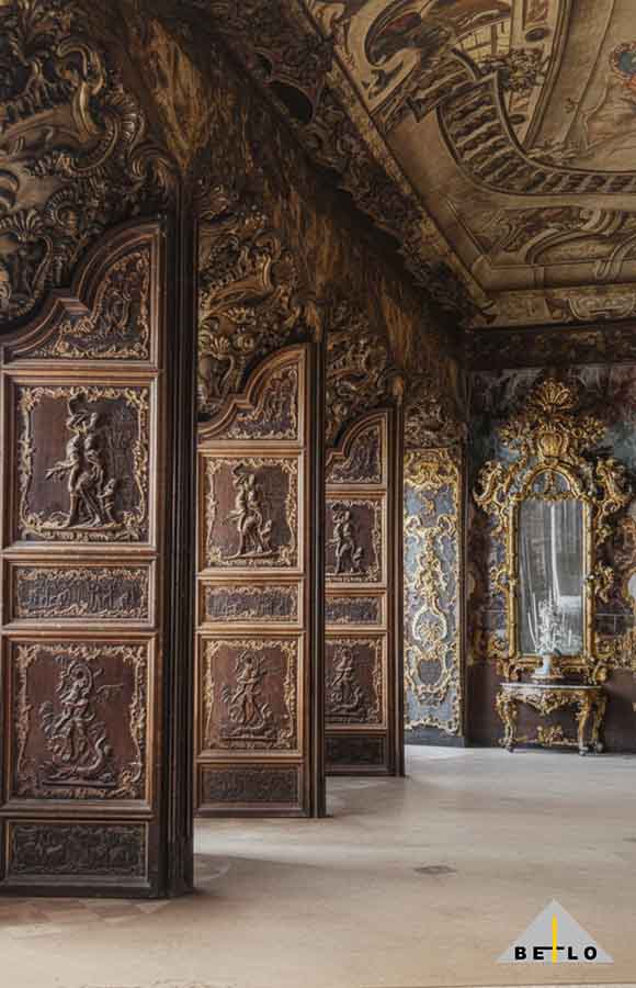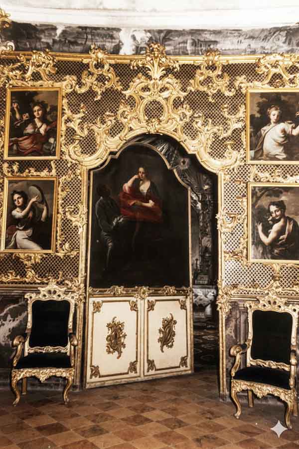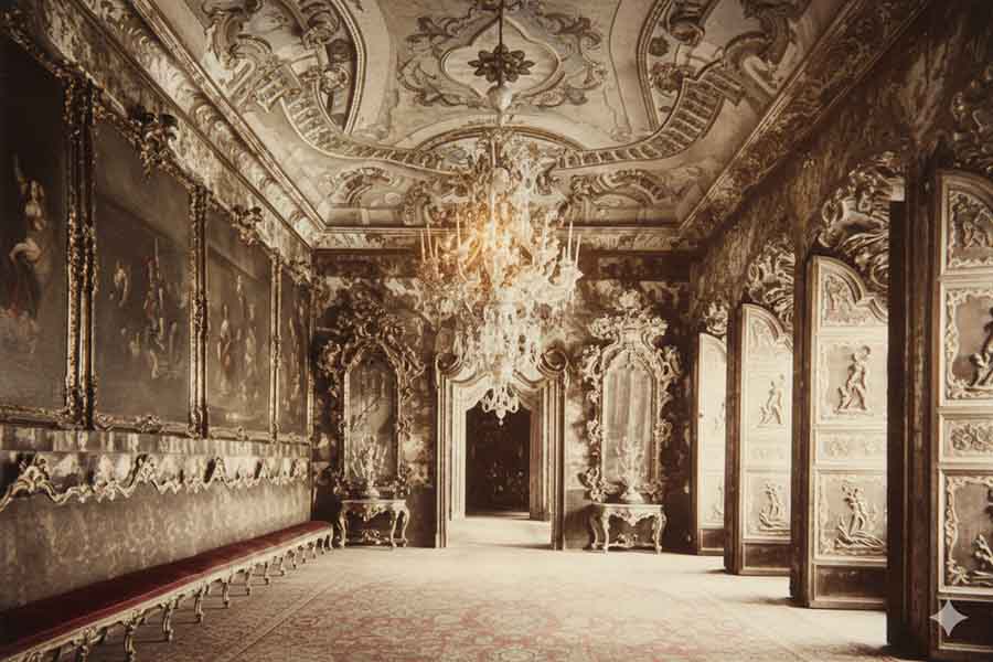 Una puerta del frente daba paso al salón del Trono (en referencia al salón de Baile), en el que se advertía una gran profusión de pinturas y adornos (FOT. 8). Techo cóncavo dejaba ver una pintura al fresco, figurando la balaustrada de una galería […]. Dos antiquísimas arañas de cristal opaco pendían de este techo. A la izquierda lucían cinco lienzos de colosal tamaño con preciosas molduras, que nos dijeron ser de Jordan (Lucas Giordano) y el Greco […]. Cinco huecos daban paso por la derecha a una galería; los tableros de las puertas contienen altos relieves bronceados, representando grupos mitológicos…. (FOT. 9)