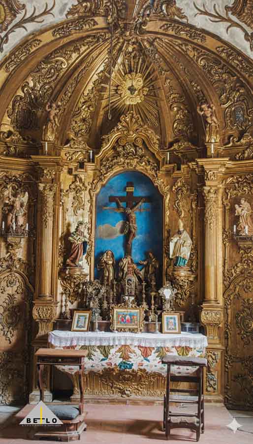 “Después de un cuarto… se entraba en una estancia techada con alta bóveda llena de molduras doradas… (en referencia a la ante-capilla). Al frente llamaba la atención una gran mampara con una pintura (FOT. 10) representando a la dueña de la casa, esposa del fundador, en el acto de dar libertad a un esclavo y recibiendo de este un ramo de flores como muestra de gratitud. Esta mampara daba entrada al Oratorio). Esta pieza es cuadrada, su techo forma cúpula adornada de talla, así como las paredes y zócalos. El retablo (FOT. 11) es dorado y de no escaso mérito, y en él se venera por efigie un Calvario, cuya imagen del Crucificado fue ejecutada por el mismo fundador, y revela bien la inteligencia artística del mismo.