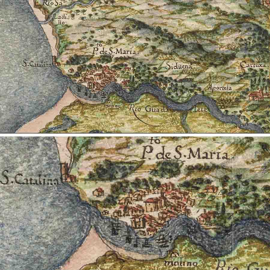 De la composición y en lo que se refiere a El Puerto y su entorno (FOT. 2) sobresale la precisión de la línea costera, con la ermita y la torre de Sta. Catalina, el trazado del rio Guadalete desde la Cartuja, con el puente, pasando por El Portal (puerto fluvial de Jerez), Sidueña hasta la desembocadura en El Puerto de Sta. María, como fondeadero de la escuadra de galeras reales, siendo notable también la importancia concedida al relieve y a la toponimia, con una profusión de denominaciones y detalles que no tendrá parangón hasta el siglo XVIII.- R.G.R.
