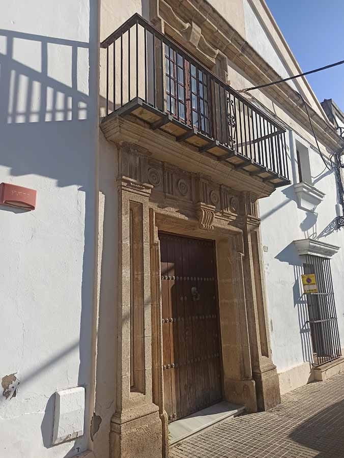 Se ha ampliado el frontón que con un óculo cegado ocupa ahora todo el lineal de la fachada recogiendo así la techumbre a dos aguas que se conserva, aunque esto solo sucede en la primera crujía, ya que el resto de lo que fue bodega es ahora un patio (FOT. 3). Se ha suprimido el entablamento que aparece en el proyecto que ha sido convertido en una cornisa de piedra. Se mantiene la estructura simétrica en torno a la puerta de acceso cuyas jambas, dintel y marco son ahora de piedra simulando una puerta palaciega y sobre la que se ha abierto un balcón con su barandilla de hierro y también con jambas, dintel y marco de piedra. Son de factura neoclásica y sencillamente ornamentadas (FOT. 4).
