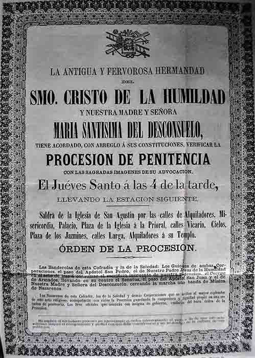 Dentro de ese renacer cofradiero en ese siglo XX hay que tener en cuenta los sucesivos estrenos de pasos, elementos constitutivos y prendas (desde los varales a las bambalinas, desde los respiraderos a los candelabros, palios, sayas, mantos y túnicas, coronas y potencias, etc.), enseres propios del cortejo procesional (cruces de guía, estandartes, faroles, etc.) y objetos de culto y exorno que contribuyen a la típica brillantez de las salidas procesionales y actos externos de las hermandades. Paralelo a todo ello se ha venido observando un paulatino auge de cultos internos, revisión, reformas y aprobación de nuevos estatutos, besamanos y besapiés, proliferación de pregones, cartelería (FOT. 5), conciertos de bandas de música, edición de revistas, boletines, programas y folletos, desarrollo de la difusión en distintos medios, etc. –