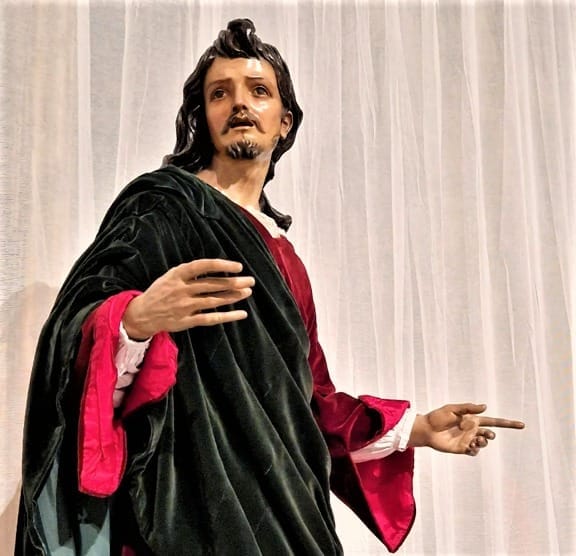 Sigue el modelo iconográfico inspirado en un pasaje apócrifo tomado de las Actas de Pilato al representar al discípulo de Jesús joven y erguido, con la cabeza girada hacia su derecha comunicando a María que su Hijo cargaba con una cruz hacia el Gólgota. La flexión de sus brazos a la altura de la cintura y la posición de las manos indican el camino a seguir hacia el encuentro en la calle de la Amargura con Jesucristo.