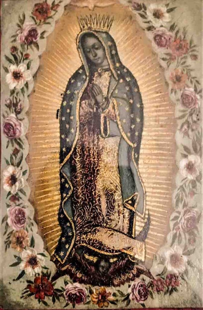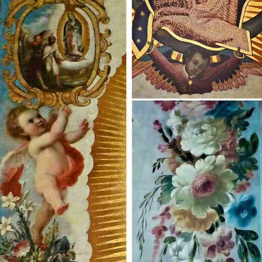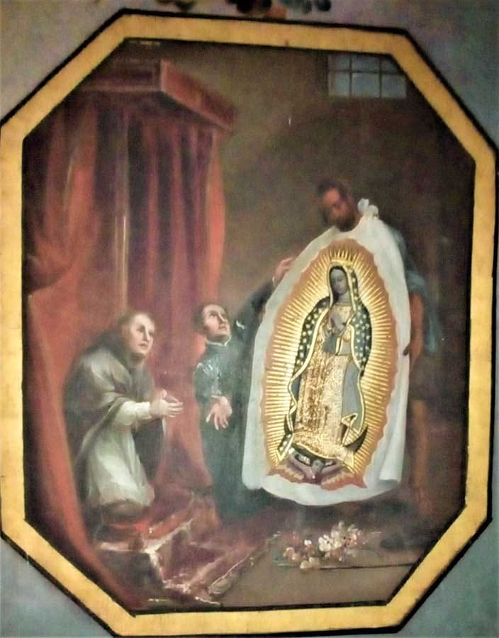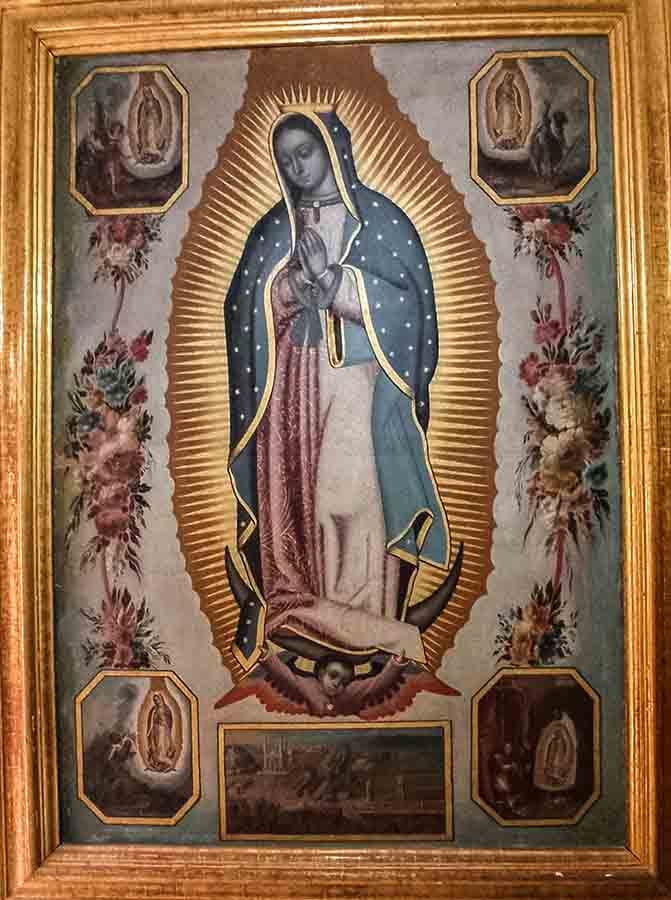 El otro modelo iconográfico muestra en cuatro medallones (FOT. 6) situados en los ángulos del lienzo la secuencia del milagro de las rosas, las apariciones de la Virgen y la estampación de la misma en la tilma de Juan Diego, origen de esta devoción mexicana (FOT. 7) y en el centro de la parte inferior otro medallón rectangular con la vista idealizada del cerro Tepeyac y el santuario construido en honor de la Virgen de Guadalupe. Éstas comienzan a mostrase avanzado el s. XVIII. En ambos modelos no faltan los elementos decorativos como guirnaldas de flores, cintas o lazos y ángeles (FOT. 8).