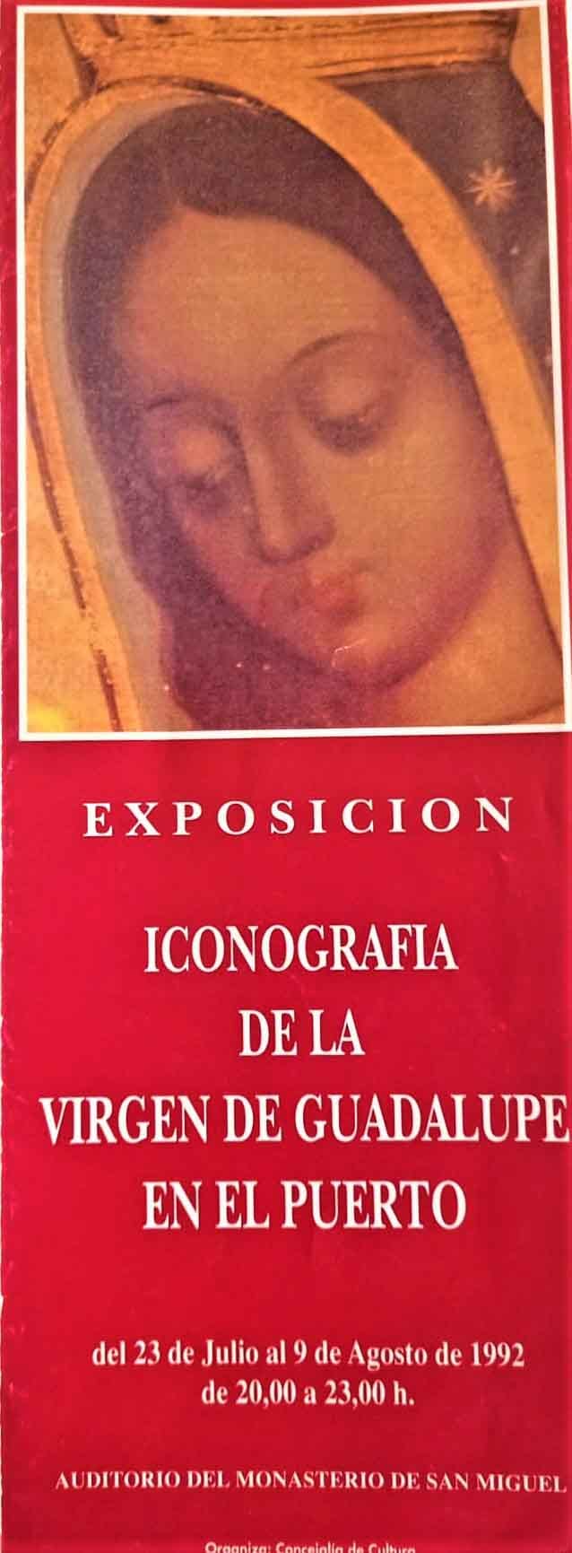 Con el título “Iconografía de la Virgen de Guadalupe en El Puerto” (FOT. 2) y organizada por la concejalía de Cultura del Ayto. portuense, la muestra fue una manera de conmemorar el V Centenario del Descubrimiento de América y recordar su repercusión en esta ciudad. Guion, textos, documentación y coordinación corrieron a cargo de Mercedes García Pazos, historiadora del arte y técnico del área de Patrimonio Histórico de El Puerto en aquellas fechas. También se encargó de la edición de un folleto-catálogo ilustrado en el que se incluía (FOT. 3) una breve descripción de las veintiséis obras expuestas.