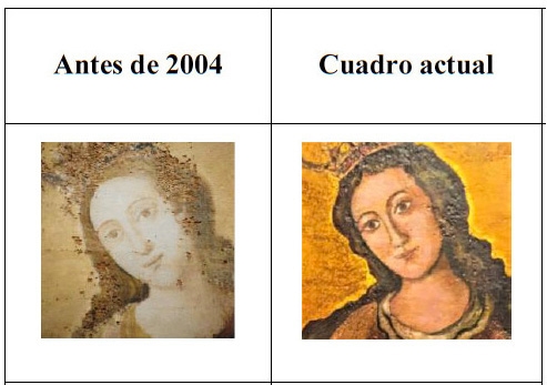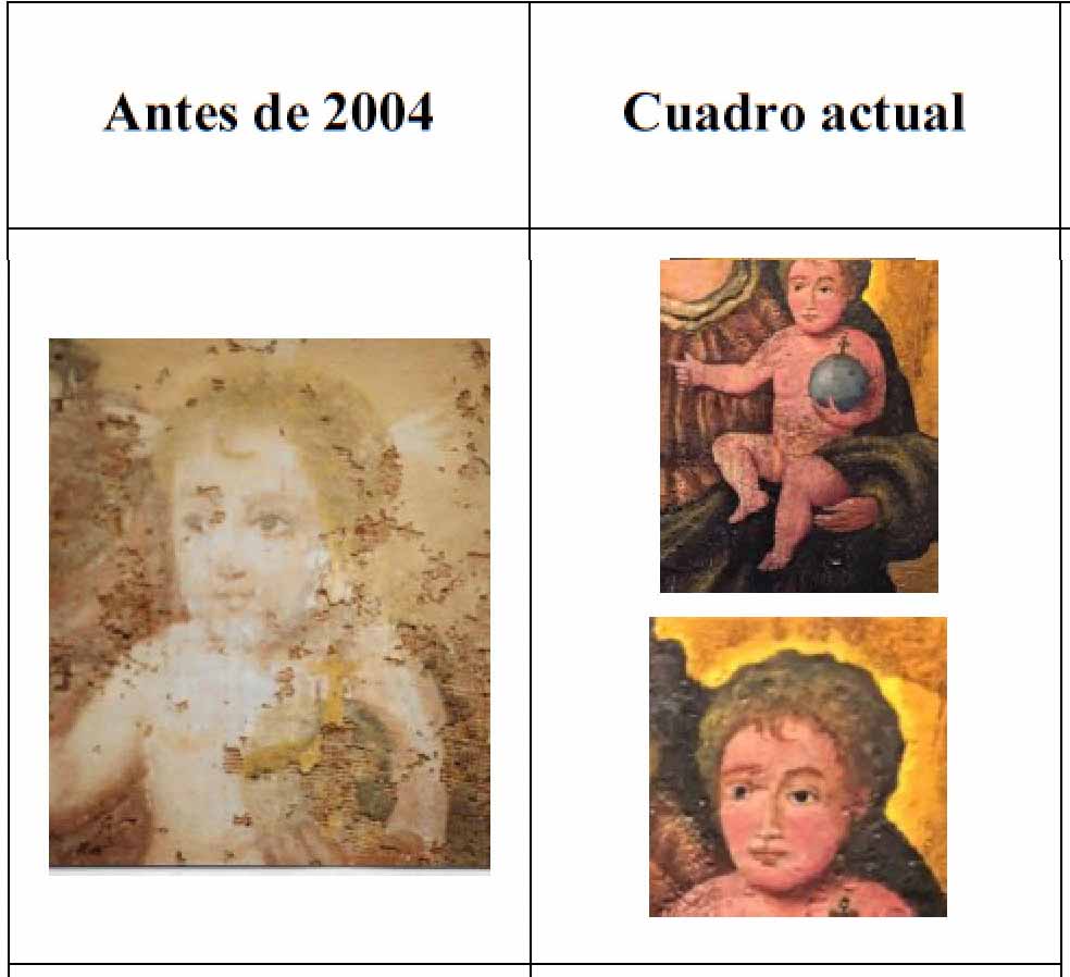 EL CUADRO ORIGINAL Y SU RESTAURACION ACTUAL. – Abusando de la cordialidad de los propietarios del cuadro tuve acceso a fotografías del original recién apeado del marco de la hornacina para su necesaria intervención en 2004 y del proceso de dicha restauración. Por segunda vez, a la vista de los cambios introducidos inexplicablemente en la pintura primitiva volví a replantearme una serie de cuestiones.