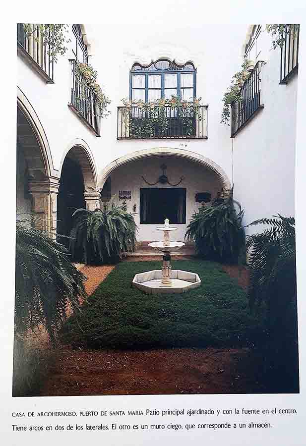 Pero, sin duda, el elemento más conocido de la casa, cuya silueta destacaba en la zona alta de El Puerto, fue su torre-mirador, lamentablemente casi perdida a causa de un derrumbe acaecido en 2015. Perteneciente al tipo conocido como de “sillón” (FOT. 8), en el que, a modo de respaldo de asiento, un cuerpo elevado ocupaba la mitad de la planta, estuvo decorada con los característicos pináculos de cerámica sevillana, y rematada con una veleta representando a San Miguel venciendo al mal.