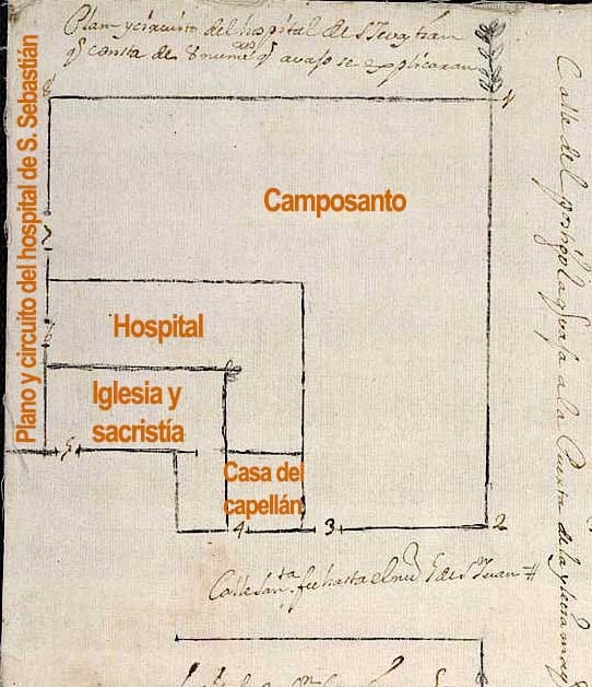 Dos planos realizados en el año 1735 recogen un detalle de la ermita y el hospital, con el cementerio situado en el mismo lugar en el que estuvo ubicado desde fines del Medievo (FOT. 2).